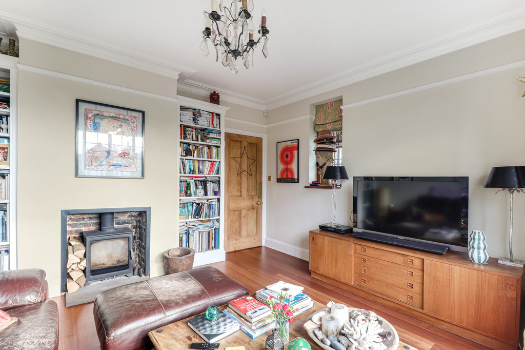 Living room features a superb wide bay window to the front, quarry tiled sill, fireplace with a working wood burning stove, coved ceiling, picture rail, fitted bookcase and Africa Padauk hardwood floor.