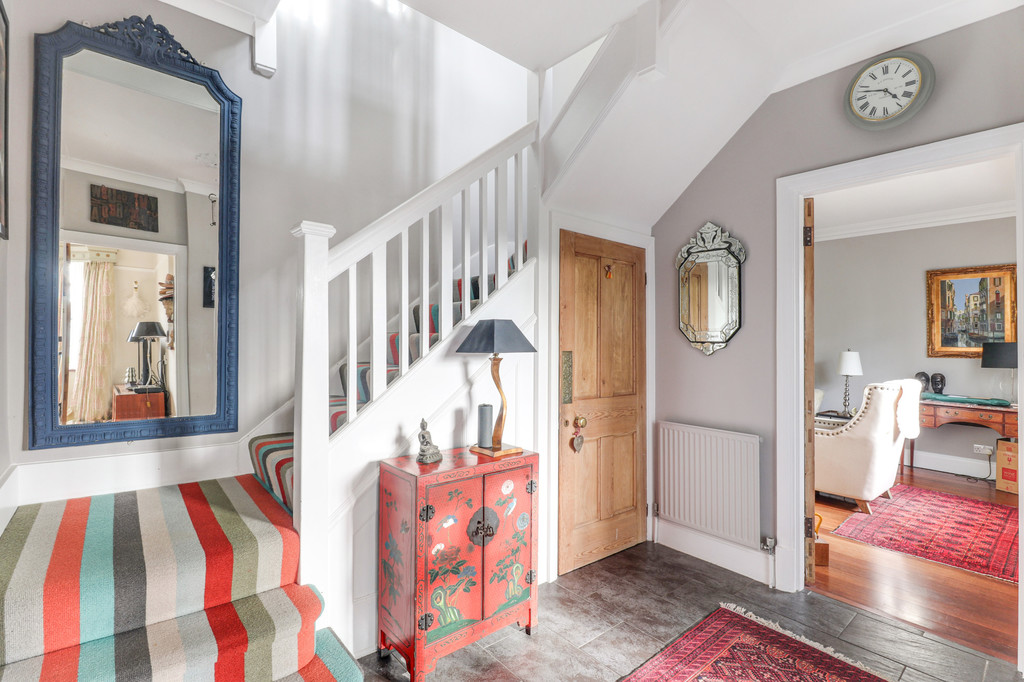 Enclosed porch with tiled floor and multipaned door to the hall with an attractive turned staircase leading to the first floor.