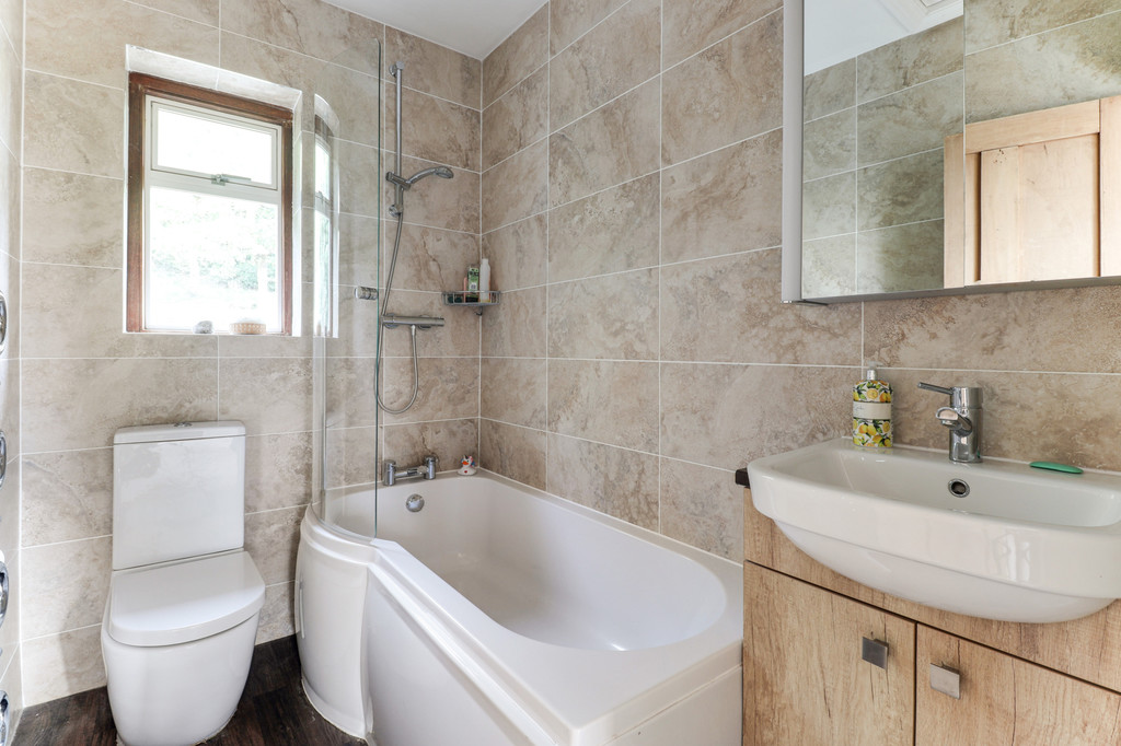 Bathroom with tiled walls, low level WC, washbasin with cupboards beneath, chrome towel rail, window and access to the roof space.