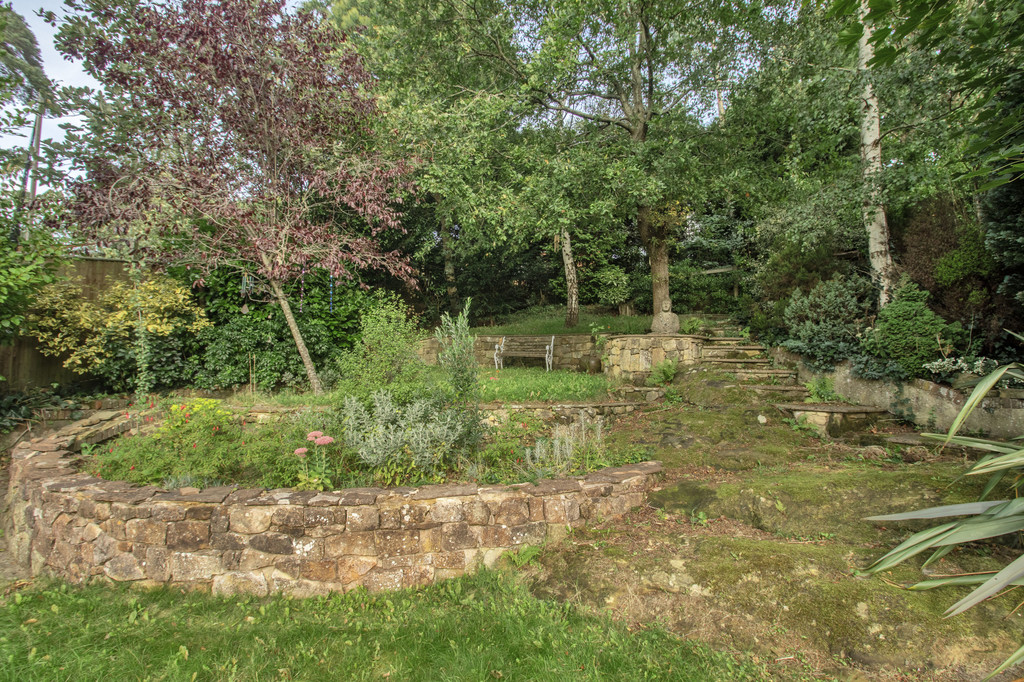 Secure gate leads to the landscaped and completely private rear garden featuring a full width paved sun terrace with BBQ at one end, mature shrubs including a Bay Tree and further decorative trees.