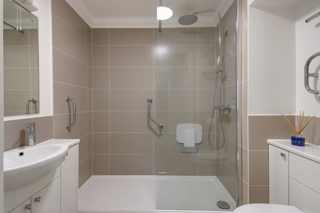 - Modern shower room with walk-in shower, hinged seat, grab rail, low level WC and washbasin.