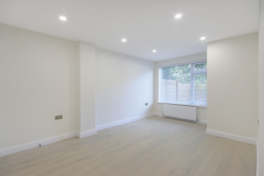 Double bedroom 1 features a large window overlooking its own garden and a wall storage cupboard, continuation of the flooring, double radiator, and modern recessed lighting.