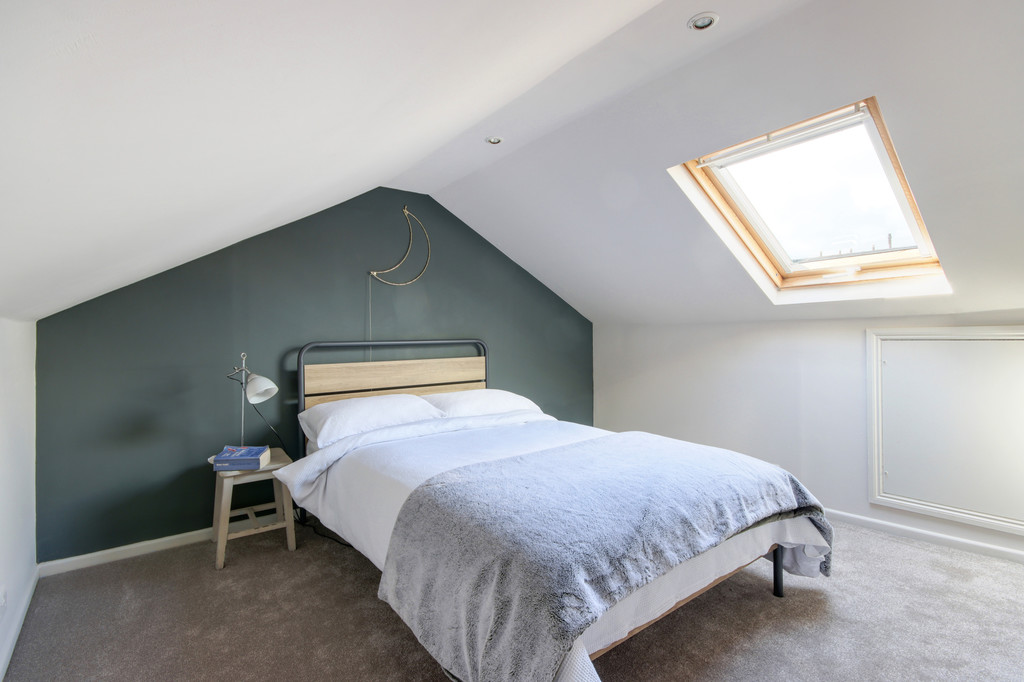 Staircase leads to second floor and bedroom 3 with Velux window to the rear useful eaves storage cupboards and built in wardrobe cupboard.
