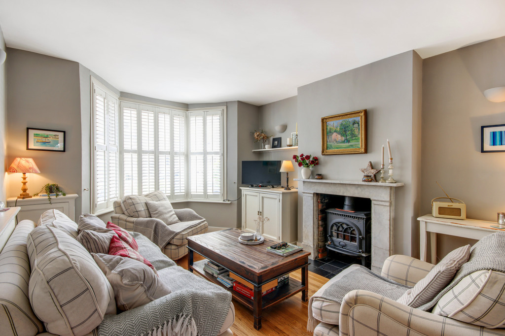 Bay window to the front is fitted with attractive shutters and the room benefits from a dual aspect with a large sash window with attractive outlook to its courtyard garden.