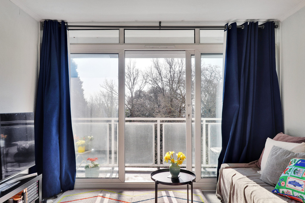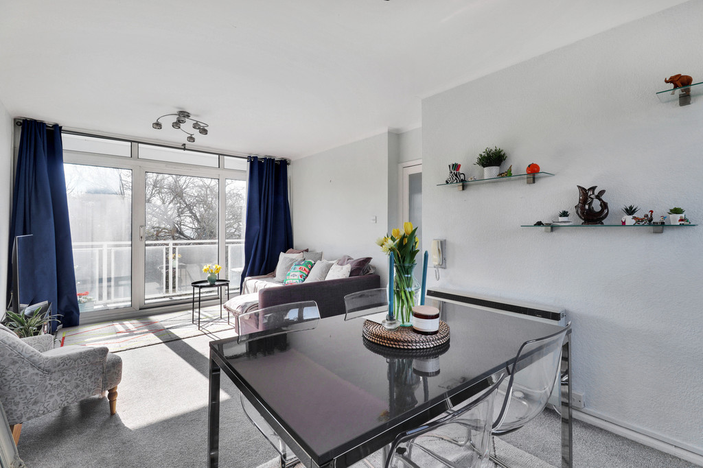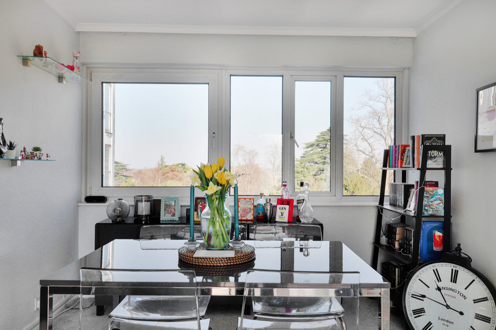 Dual aspect sitting/dining room with full width and height double glazed patio doors out to balcony, with sufficient space for bistro table and chairs plus full width window with views to London.