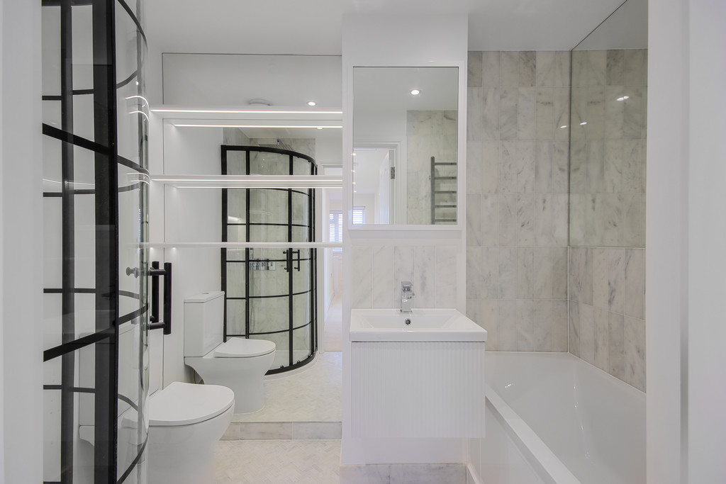 Brand new bathroom with marble herringbone tiled flooring and matching marble tiled walls, panelled bath with handheld shower above, washbasin with vanity cupboard beneath low level WC, shower cubicle with handheld and drench head showers, also with illuminated soap recess, attractive large, fitted mirrors incorporating illuminated shelves.