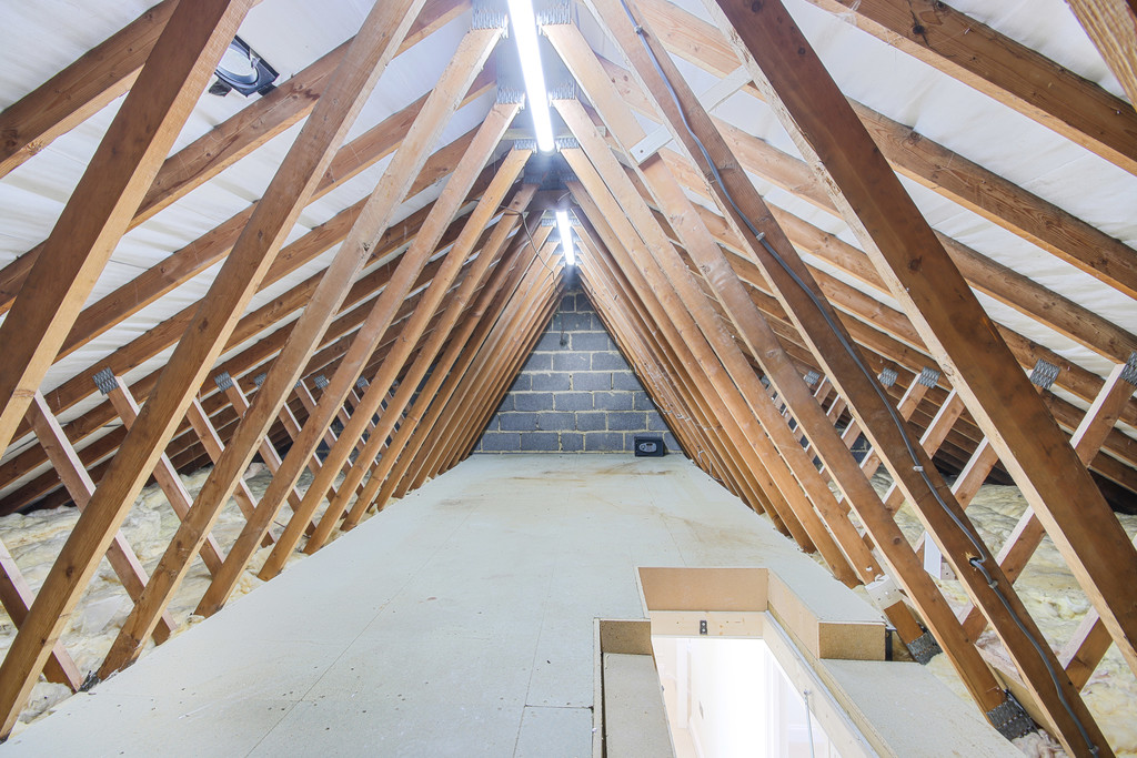 Access with wooden folding steps lead to a good sized attic with boarding and light connected.