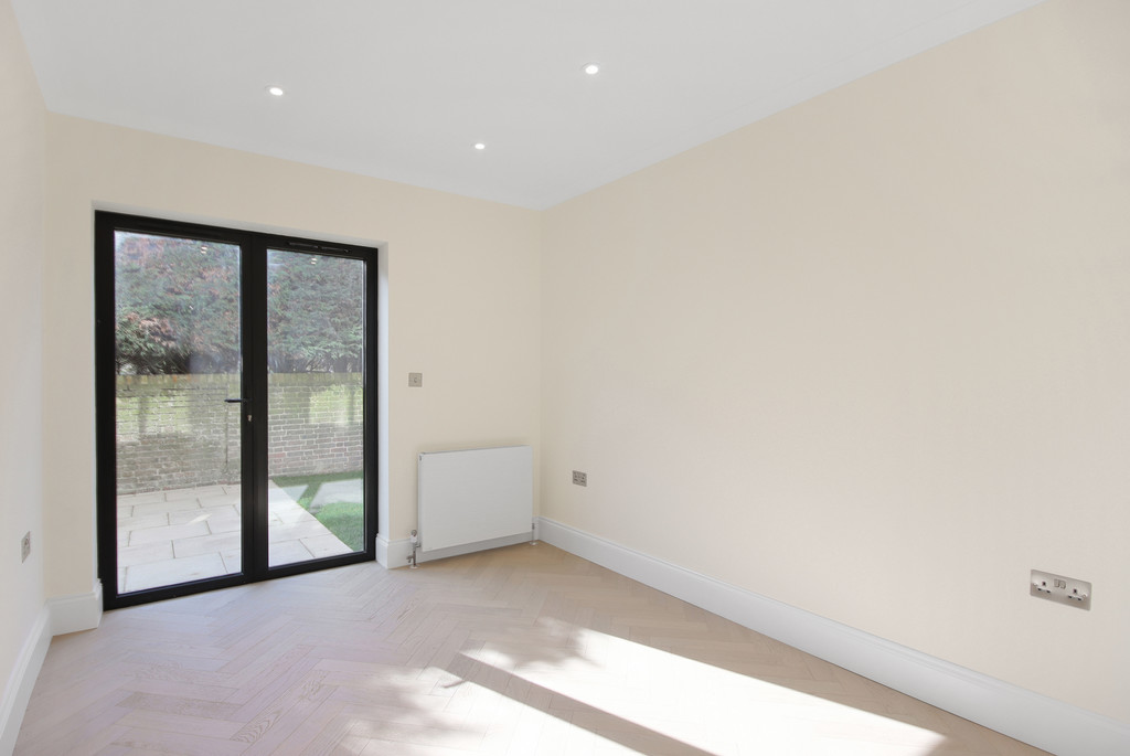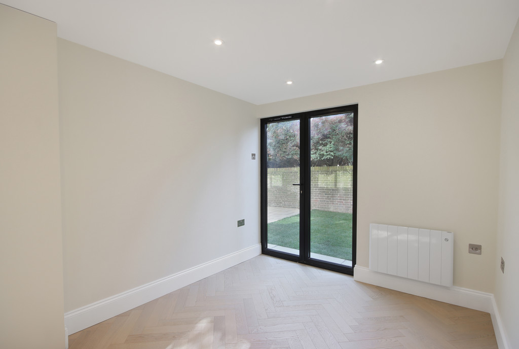 External access to office with french doors leading out to the garden, matching solid wood herringbone block flooring, recessed lighting and internal door to the storeroom.