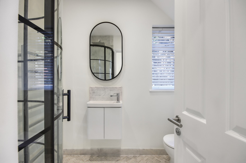 Brand new cloak/shower room with marbled herringbone flooring, separate shower cubicle with drench and handheld showers, low level WC, small wash basin with cupboard beneath, chrome towel radiator and window to the side.