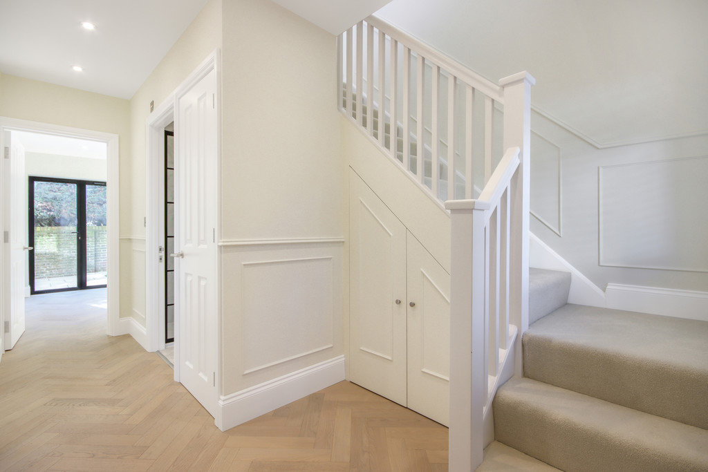 Hall with panelled walls recessed lighting and useful understairs storage cupboard plus a utility cupboard with washing machine.