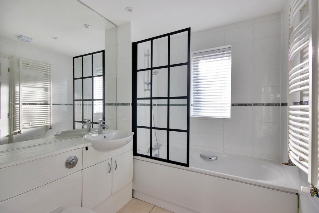 Jack and Jill bathroom fitted with panelled bath, shower attachment above and screen, washbasin with cupboards beneath, low level WC with concealed cistern, heated towel rail, window to the rear with fitted slatted blinds, tiled wall and floor.
